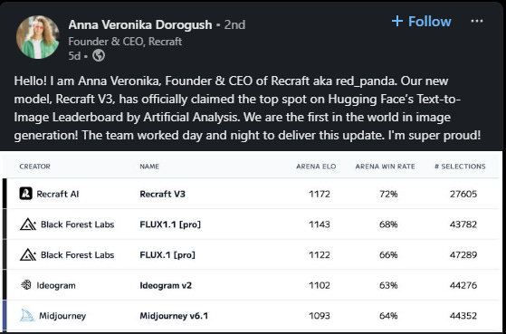 Recraft, a London-based AI graphic design startup, has unveiled Recraft V3, an AI image generator that has outperformed models like Midjourney and Stability AI in benchmarks. Recraft V3 excels in text generation, anatomical accuracy, prompt understanding, and aesthetic quality, setting a new standard in AI-generated imagery